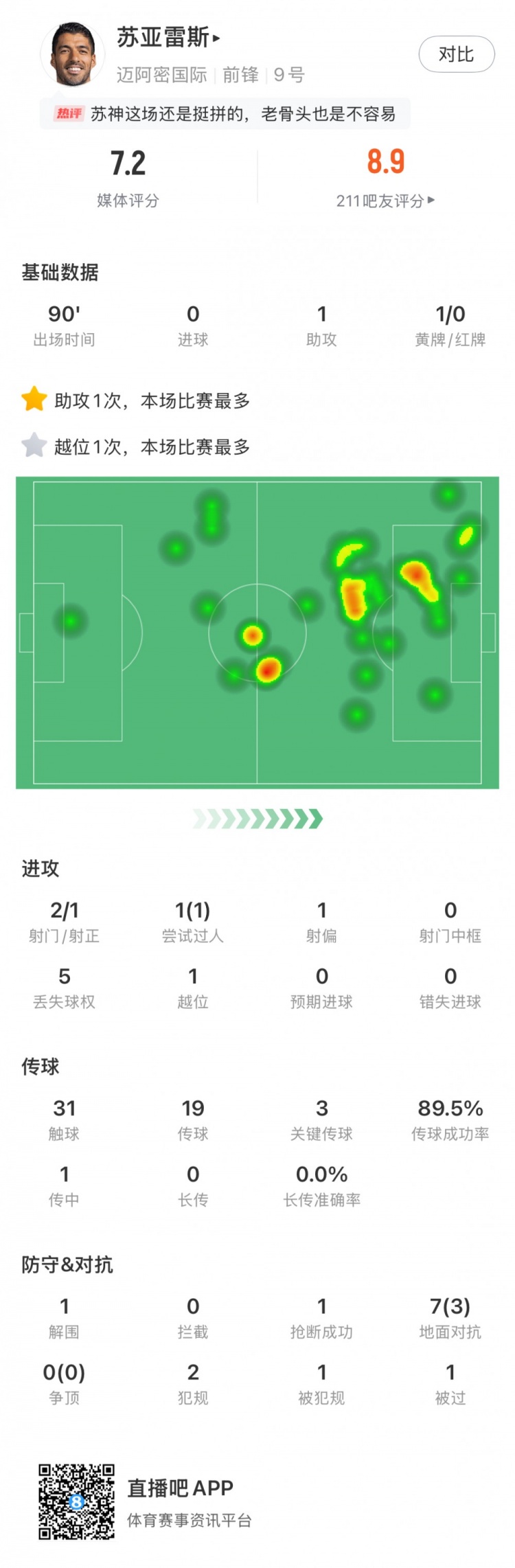 8月28日最新消息 联盟杯半决赛中,迈阿密国际以3-1逆转战胜奥兰多城,成功挺进决赛。苏亚雷斯此役打满全场,送出一次助攻,赛后获评7.2分。